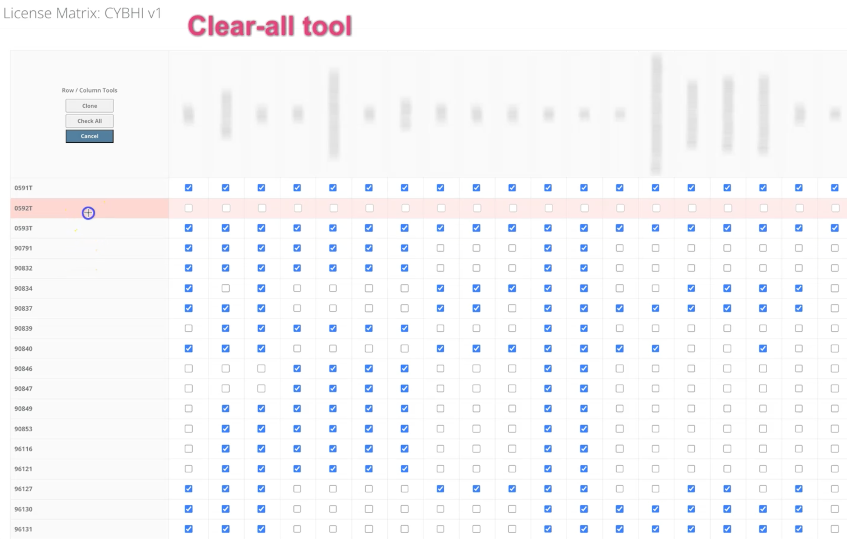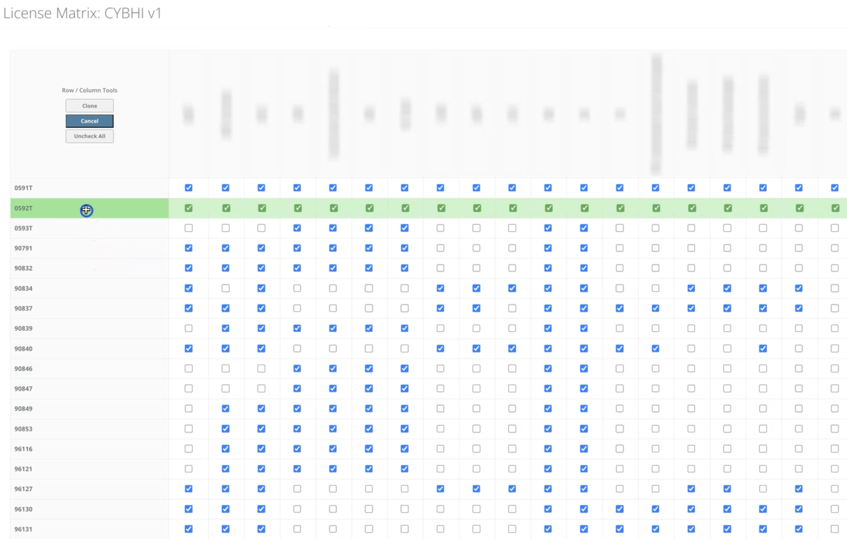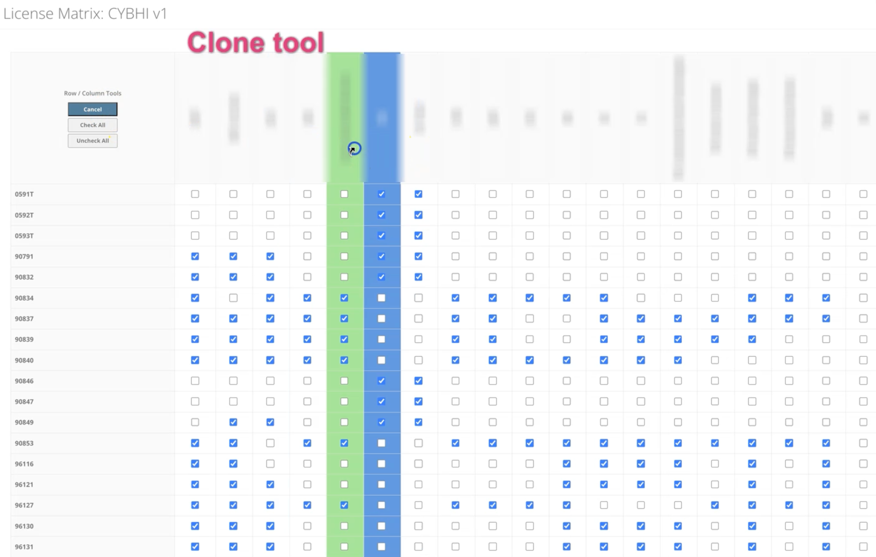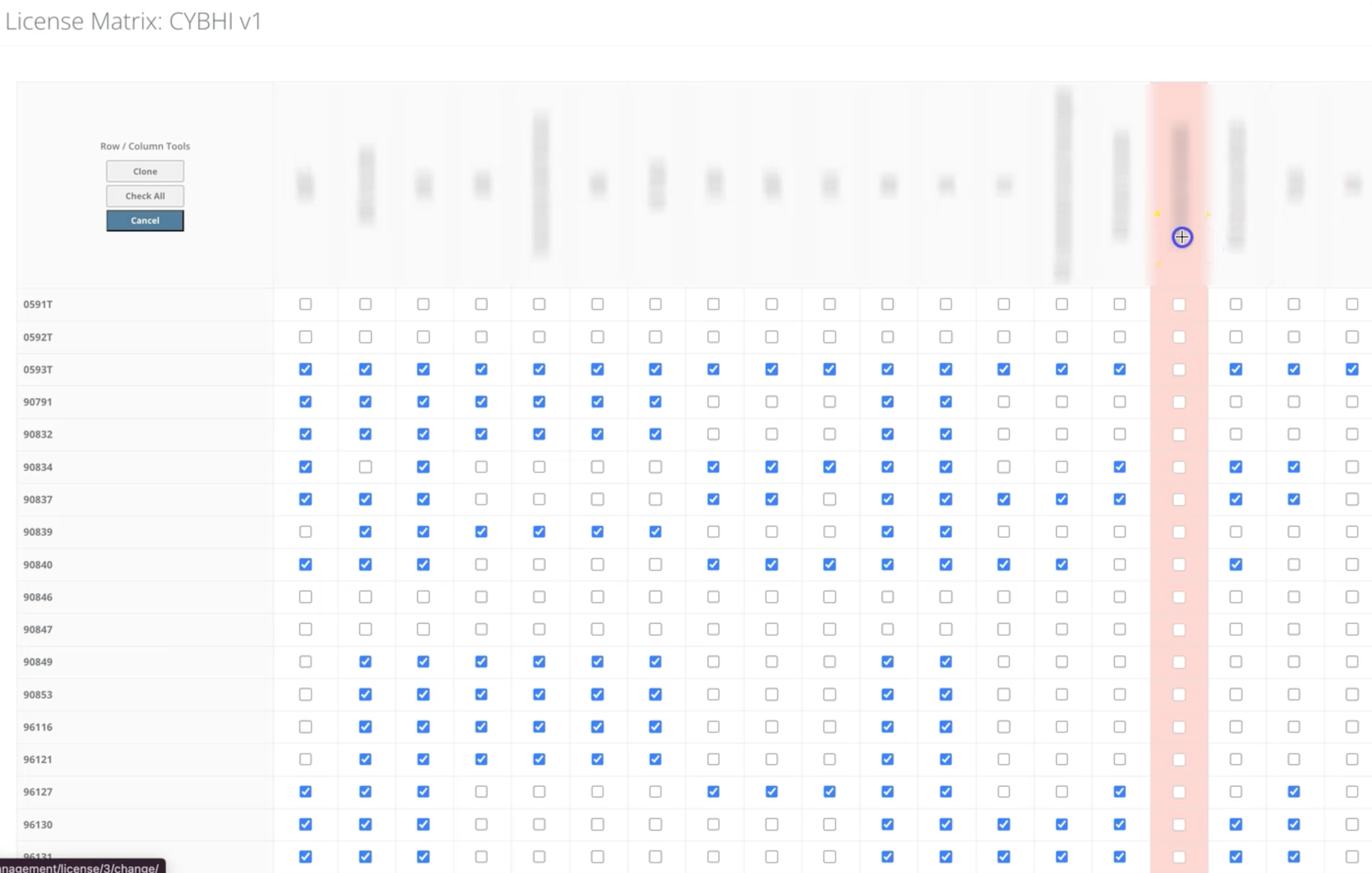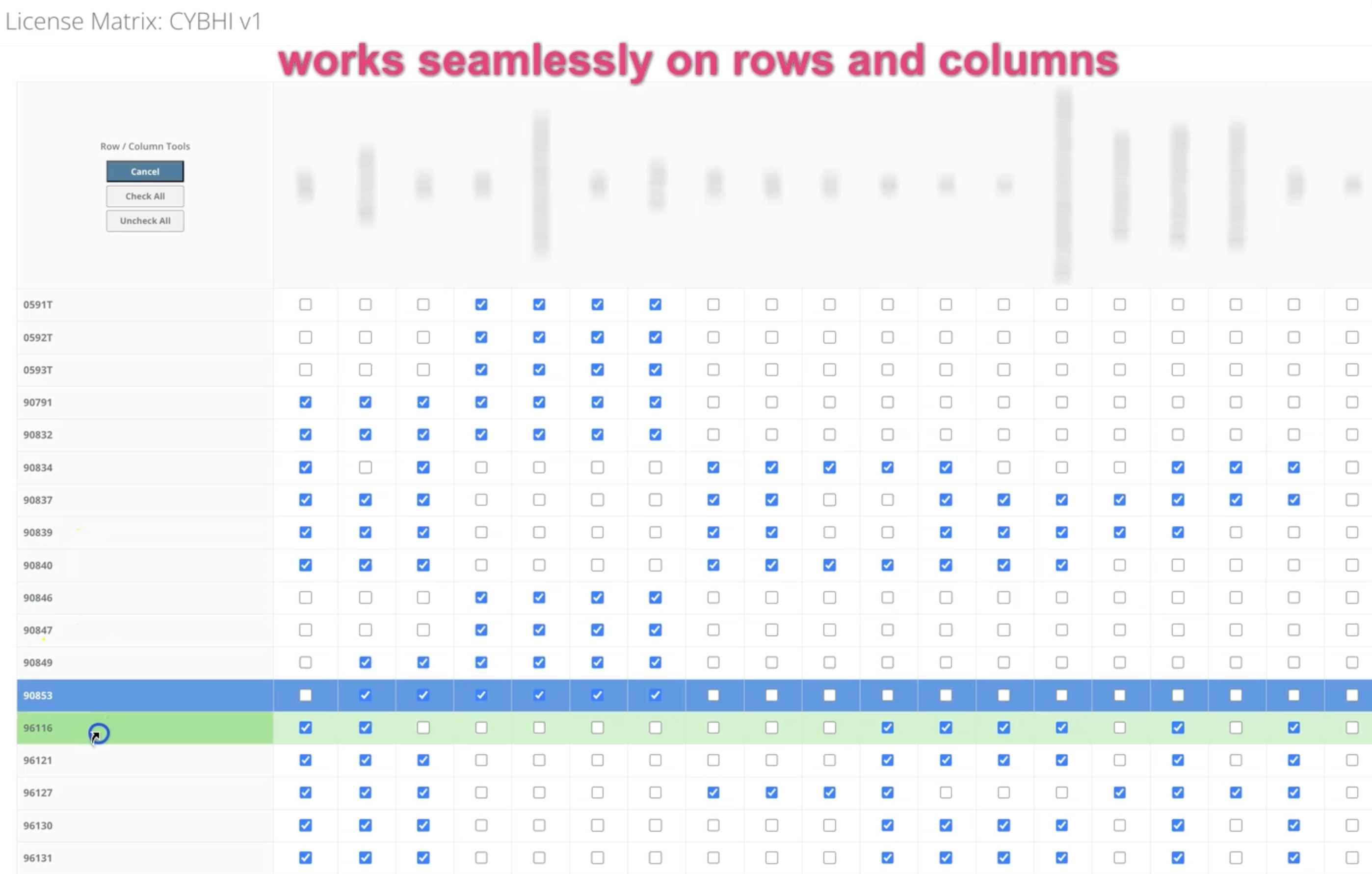 Another piece is a license matrix widget: a single admin page for managing which provider license types (LCSW, Psych, AMFT, etc.) can bill which CPT codes. Rows are procedure codes, columns are license types, all rendered as a checkbox grid with three tools that work on both rows and columns depending on cursor position: check all, uncheck all, and copy (which applies an entire row or column to another). This replaced the need to manage hundreds of individual M2M relationships across separate admin pages, turning it into a single visual interface editable by non-technical staff.