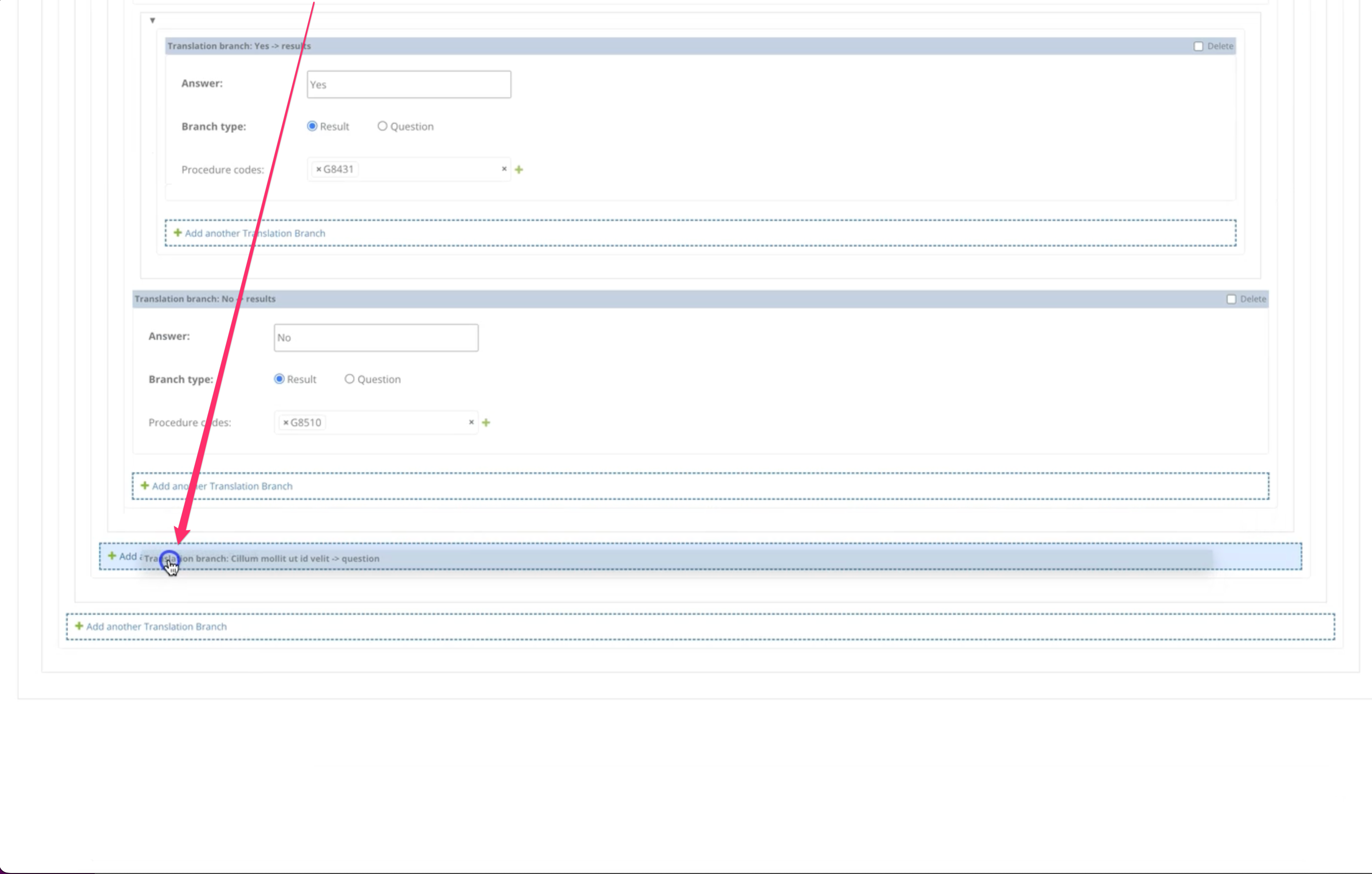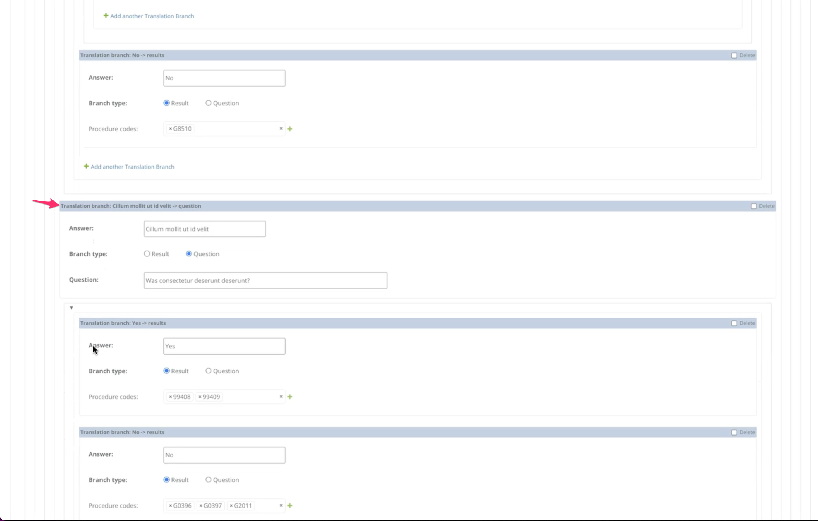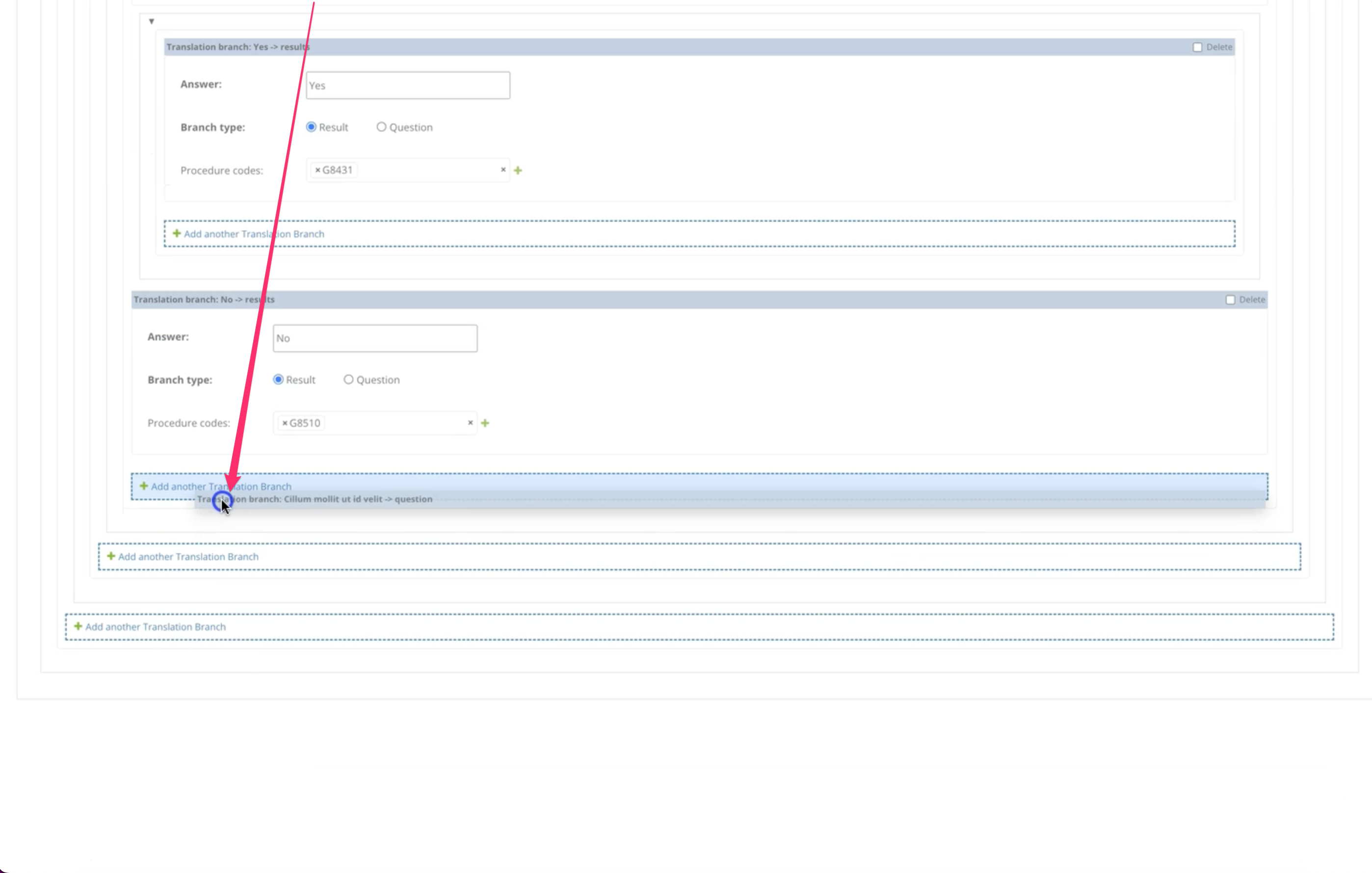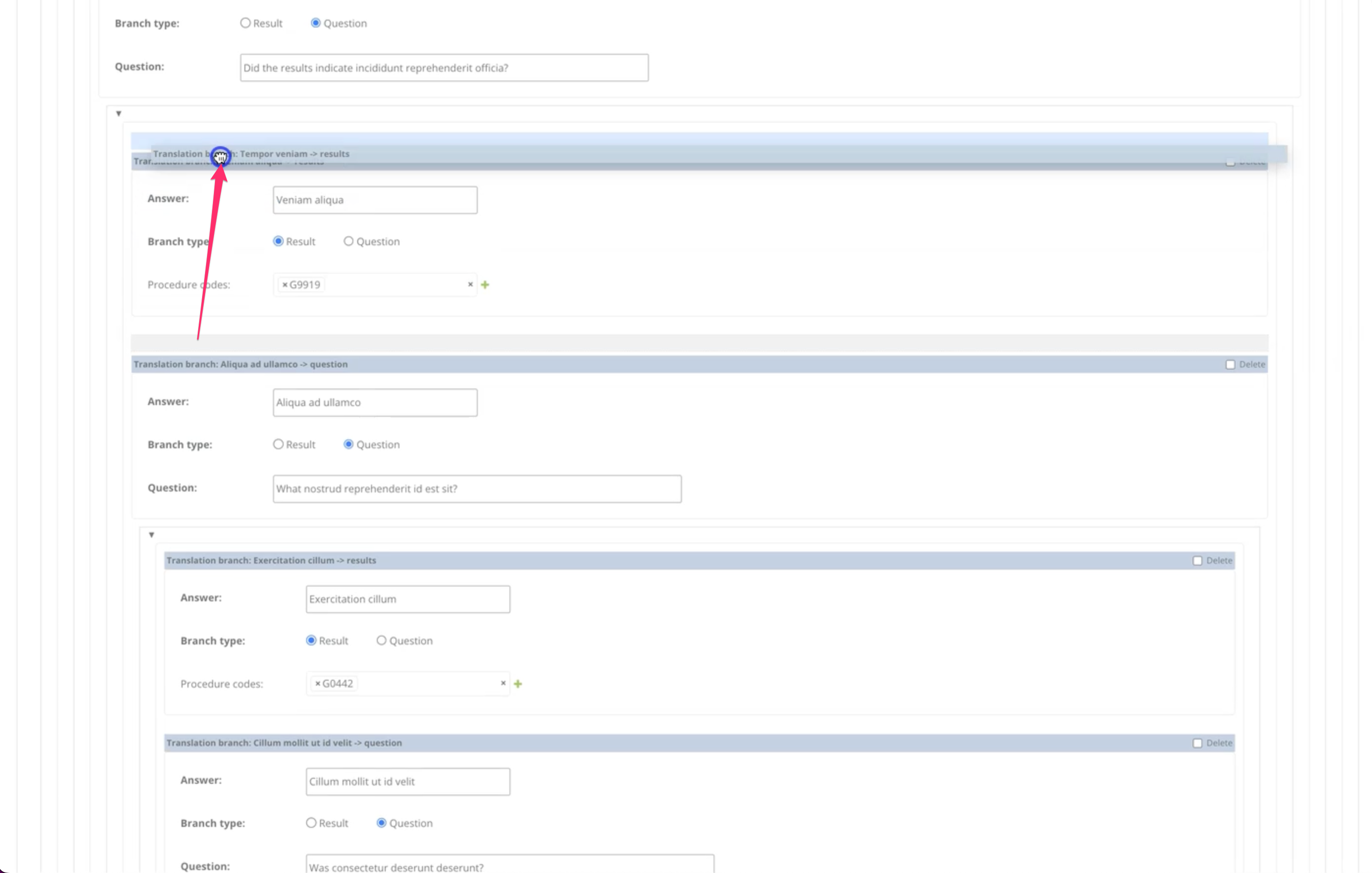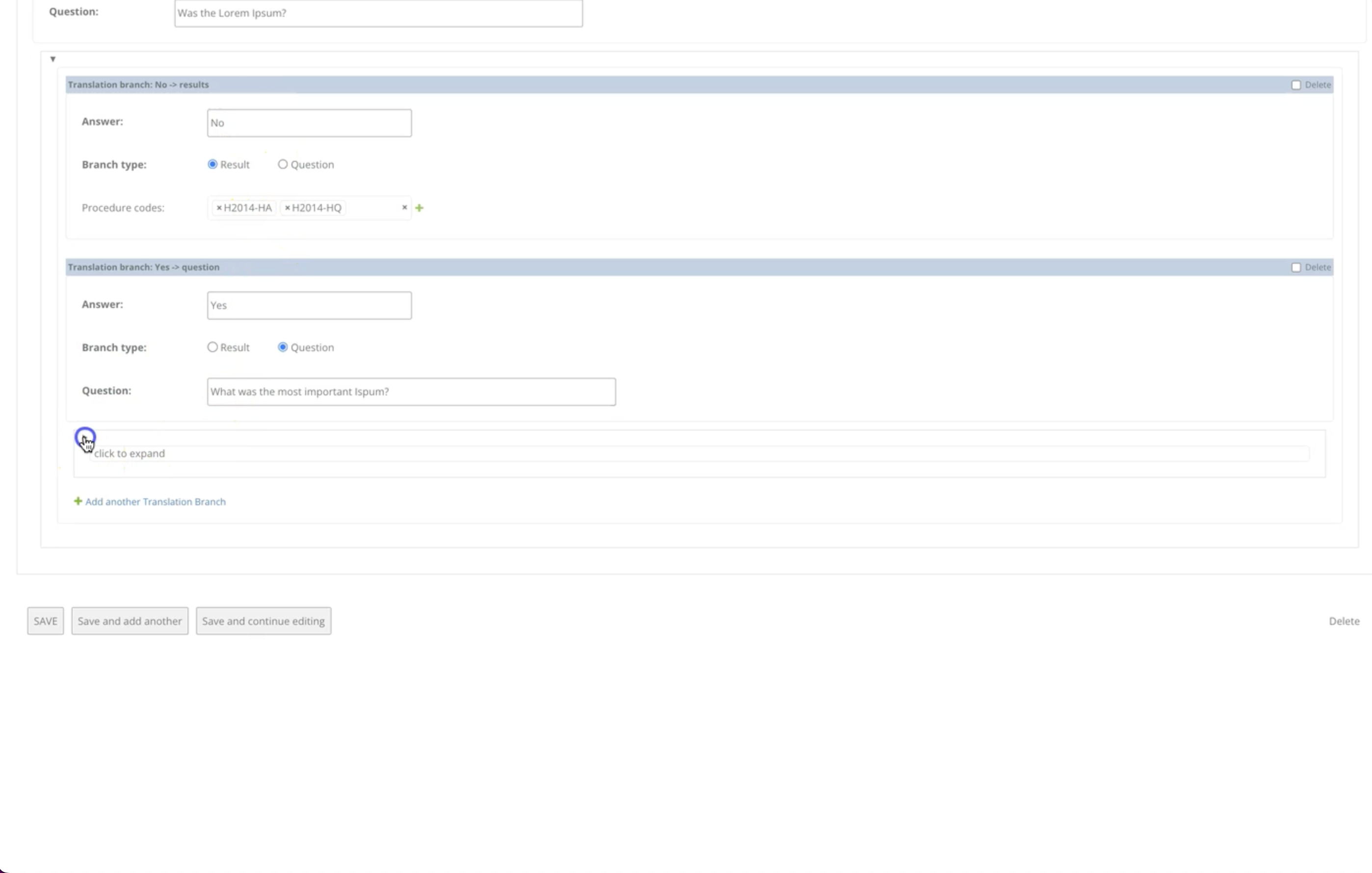 The most complex piece is a questions & answers tree editor for configuring an AI billing assistant’s decision logic. Each tree is a self-referencing hierarchy: a root question branches into answers, which lead to either result nodes (with CPT procedure codes) or further questions, nested arbitrarily deep. Built with django-nested-inline, but heavily customized. Out of the box, django-nested-inline only supports drag & drop within the same nesting level, and doesn’t support self-referencing foreign keys at all. I worked around both limitations: you can drag a subtree from any depth and drop it onto any “Add another” link at any other level, with the dragged content collapsing cleanly during the move.