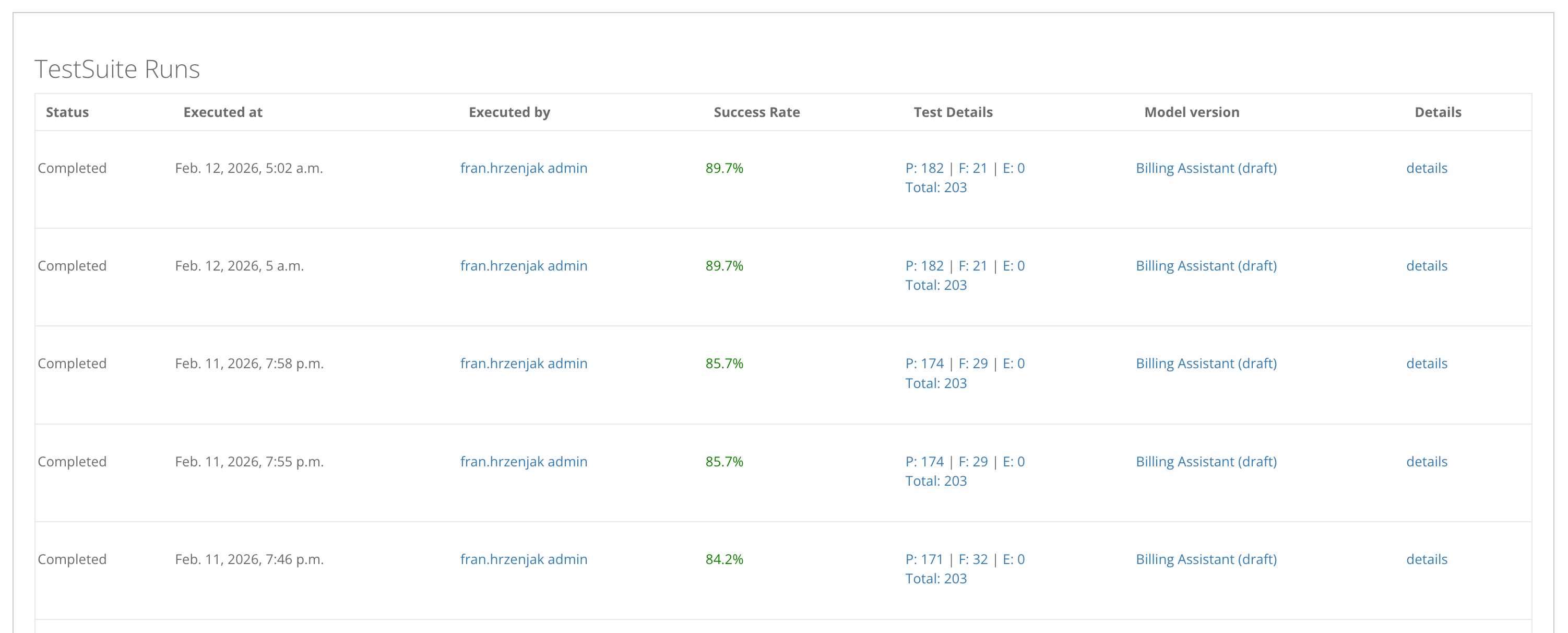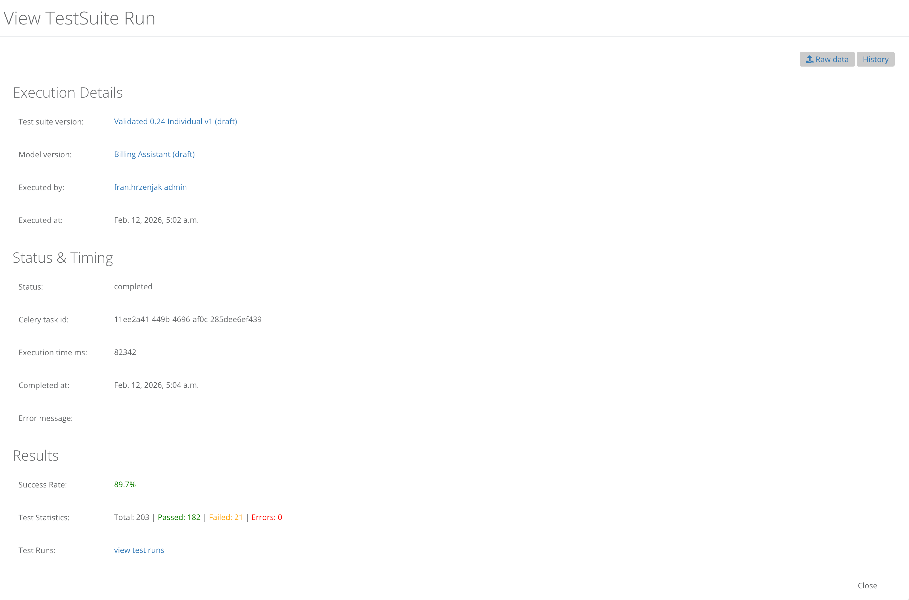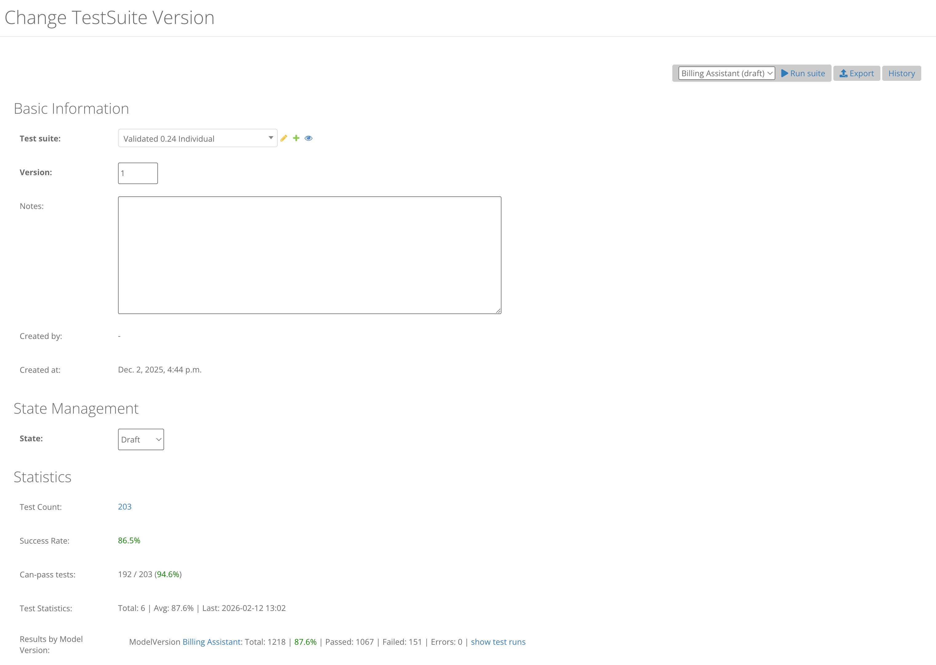 Also built the admin section for a versioned configuration system for an AI Billing Assistant that runs on AWS Lambda functions. The configuration can be exported as YAML, imported with validation (including license mismatch detection against the matrix). The section also includes the ability to configure and run regression test suites against the AI Billing Assistant. Test suites run 200+ cases via Celery, using several parallel runners. The LLM responses are compared against pre-validated expected outputs, with pass/fail tracking, execution time per case, and an overall statistical score is calculated.