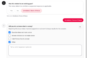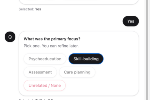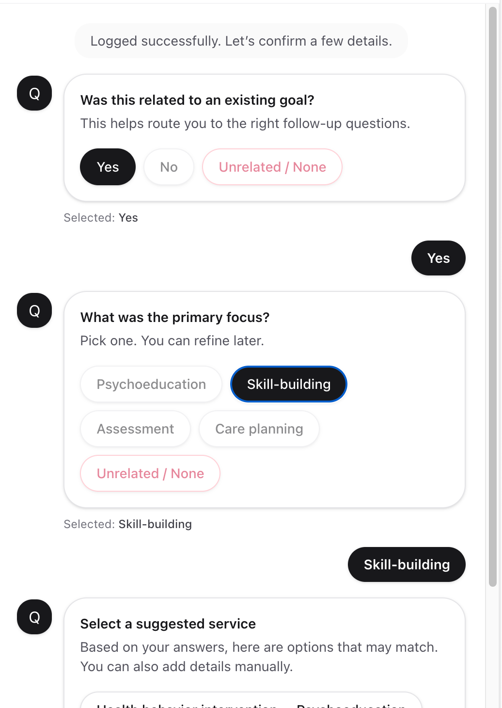 Enhanced the clinician feedback flow from a minimal “!” button that ended the conversation, to a structured form collecting issue type (question doesn’t make sense, answer choices don’t make sense, other) with free-text details. Every interaction is fully audited: questions asked, answers given, feedback submitted, retries.