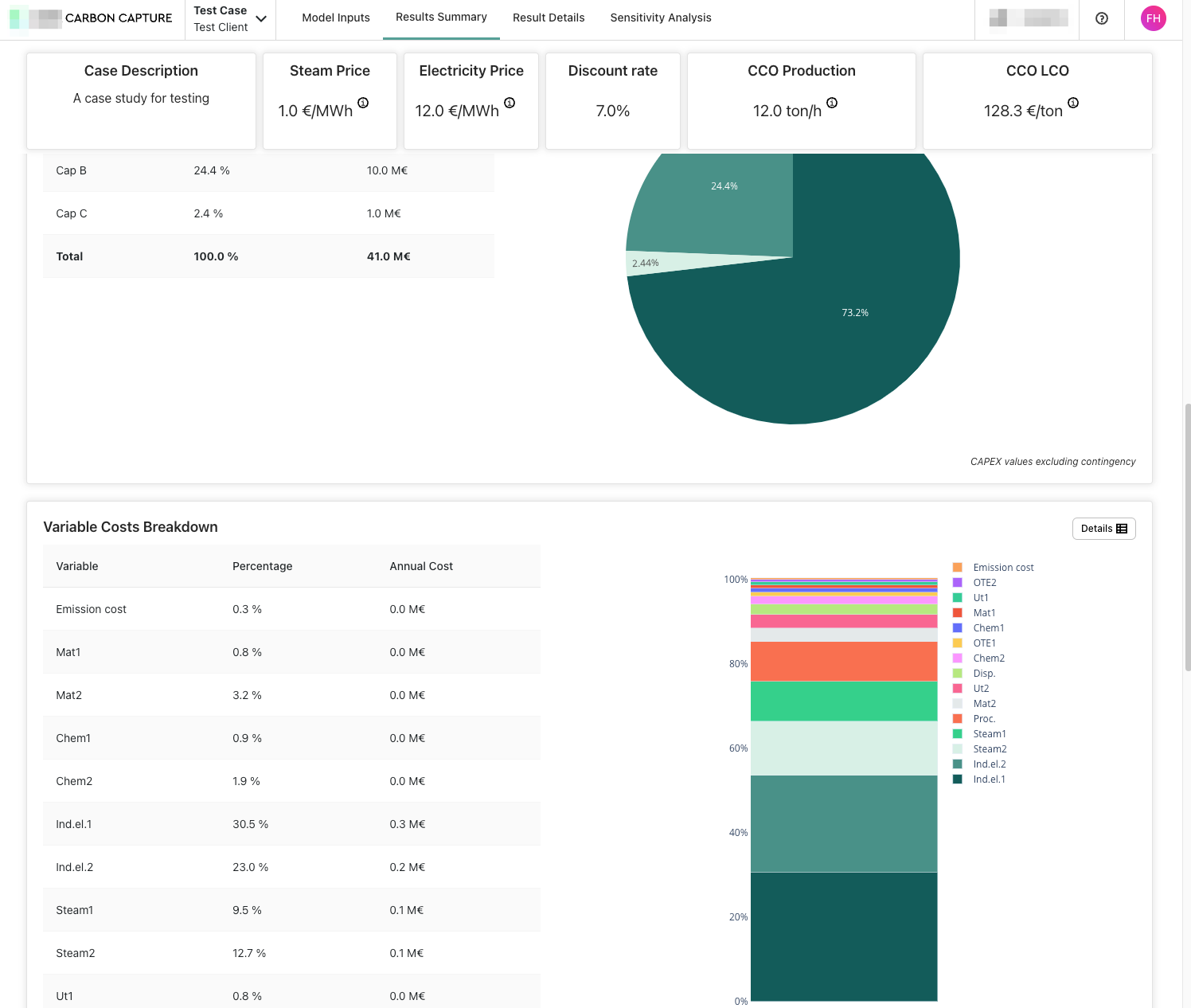 Working at Cognite A/S, I led development of a web-based economic analysis tool for evaluating carbon capture project viability. The end customer was a major energy company exploring carbon capture as a service. Engineers and economists used the tool to define capture projects with detailed technical and economic parameters, then compute the Levelized Cost of CO2 (LCO), which is the minimum price per ton of captured CO2 that makes a project break even on net present value.