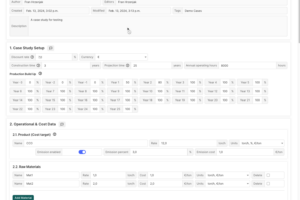 The input side was the most complex UI work. Case studies have dozens of parameters across multiple categories: construction timelines, production ramp-up profiles, raw materials, chemicals, utilities, labor, CO2 transport and storage costs, capital expenditure line items, and more. All built as dynamic Django forms with inline formsets for variable-length data, validation on save (if the calculation fails, the case study is saved as draft with an error message so the user can fix and retry).