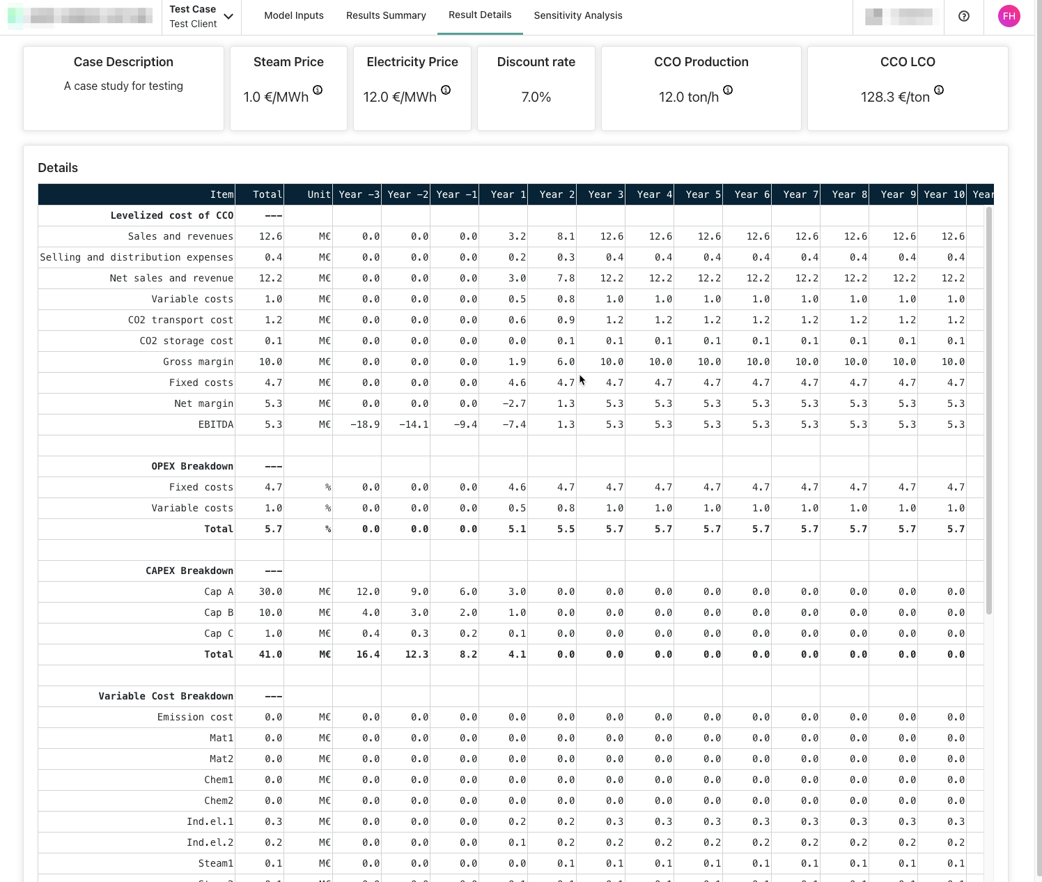The input workflow was the most complex UI work. Scenario definitions included dozens of parameters across multiple categories (timelines, ramp-up profiles, consumables/utilities, labor, transport/storage, and detailed capital and operating cost line items). I implemented dynamic Django forms with inline formsets for variable-length structures, strong validation, and a draft/error workflow: if a calculation fails, the scenario is saved as a draft with an actionable error message so the user can correct inputs and retry safely.