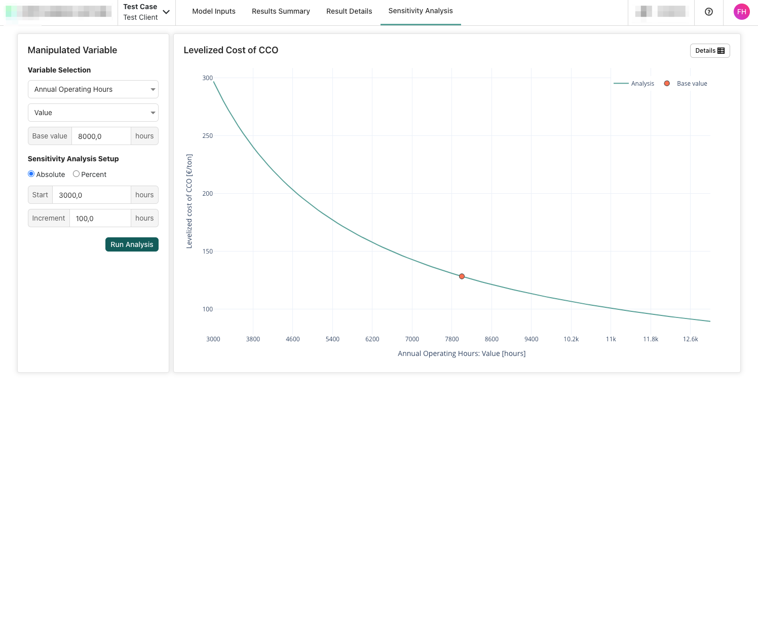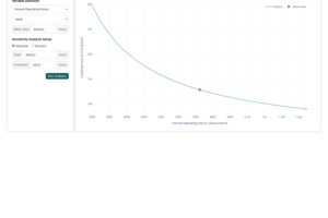 – A sensitivity analysis view where users select variables, define ranges, and visualize their impact on the levelized-cost metric.